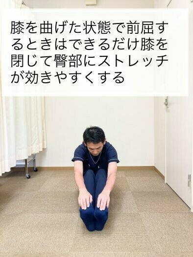 このような場合は、無理に膝伸ばした状態で強くストレッチすることは避け写真のように膝を曲げた状態でストレッチを行うことで前屈動作もやりやすくなります。