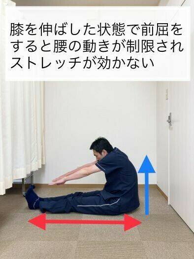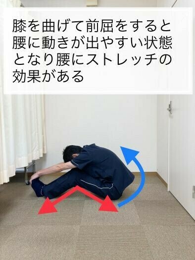 前屈といえば膝を伸ばして腰を前方に曲げるというイメージかと思いますが、太ももの後ろ側が硬くて伸びない場合には無理に膝を伸ばして前屈動作を繰り返しても太ももの裏にばかりつっぱり感を感じるだけで腰には全く動きが出ていないということがあります。