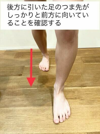 次につま先の方向がまっすぐ前を向いていることを確認し、後ろに出した足の膝をしっかり伸ばしてふくらはぎに伸びている感じが出たらOKです。