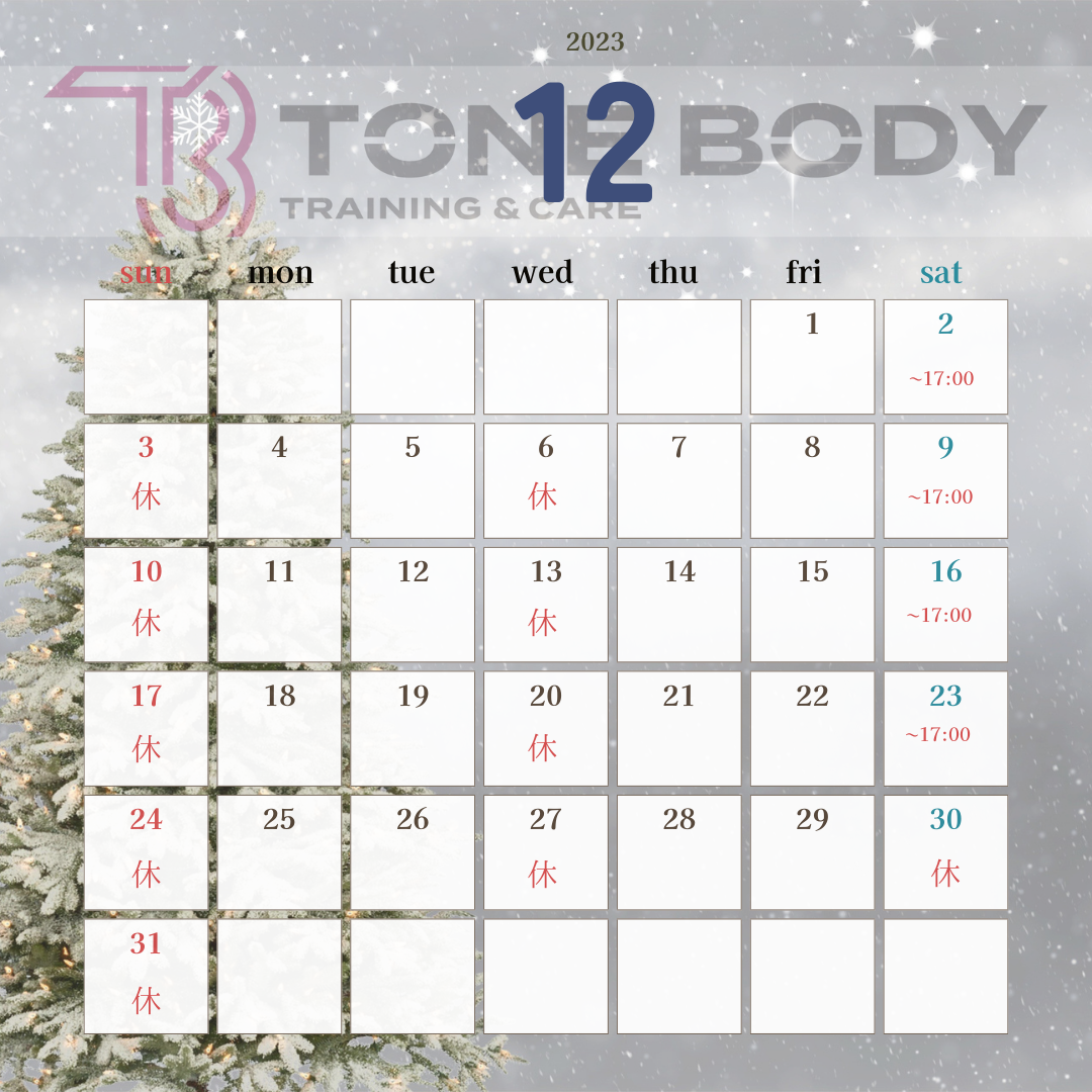 今日は当院グループであるスポーツジムTONEBODYの年末年始営業日についてのお知らせです。