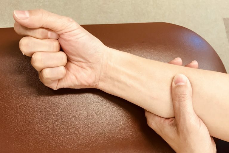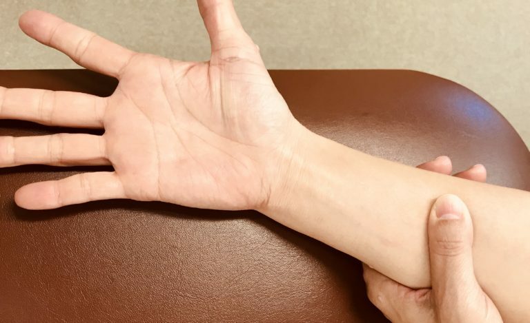 手の平を上に向けた状態で指を握り、手首からややひじよりを親指でしっかりと押さえたまま指をパーの状態に伸ばしていく!
