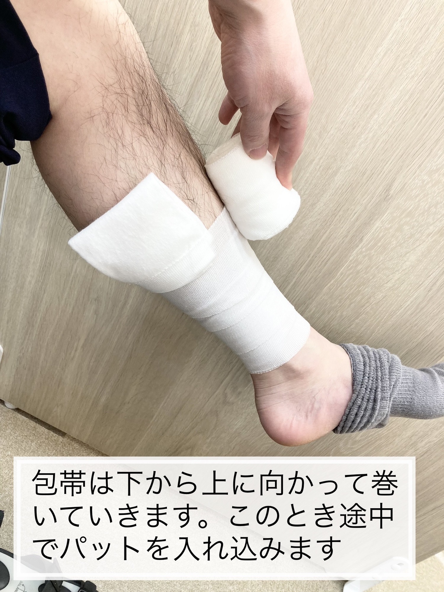 巻き方は痛めた部分の下から上に向かって巻いていきましょう。