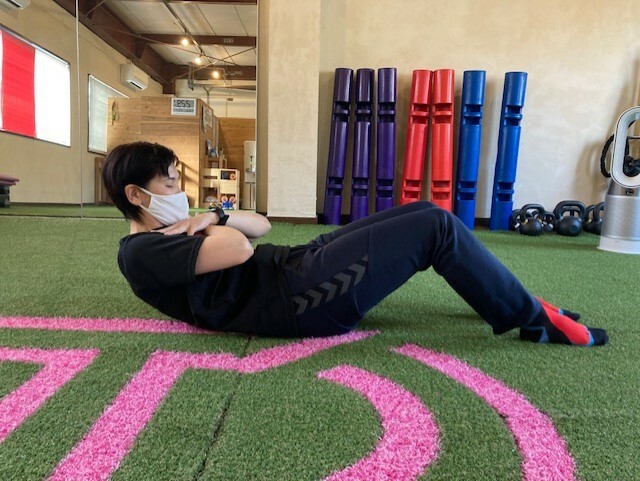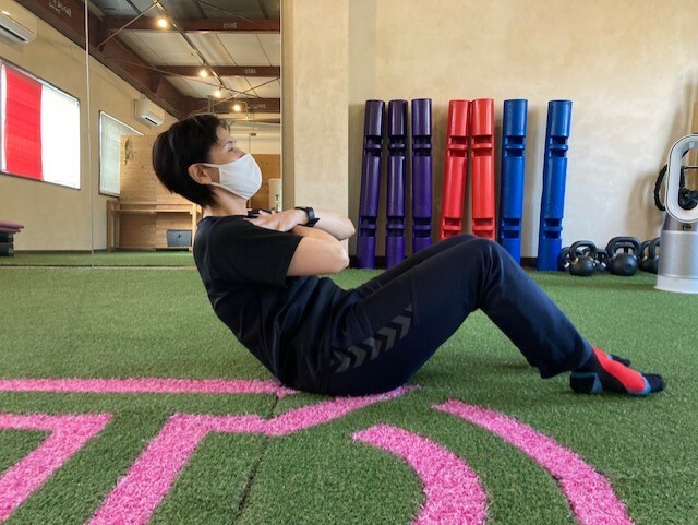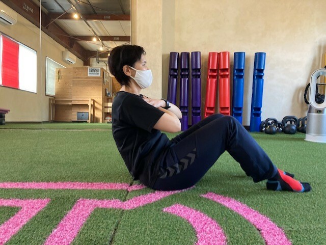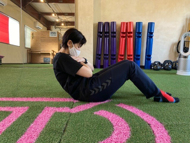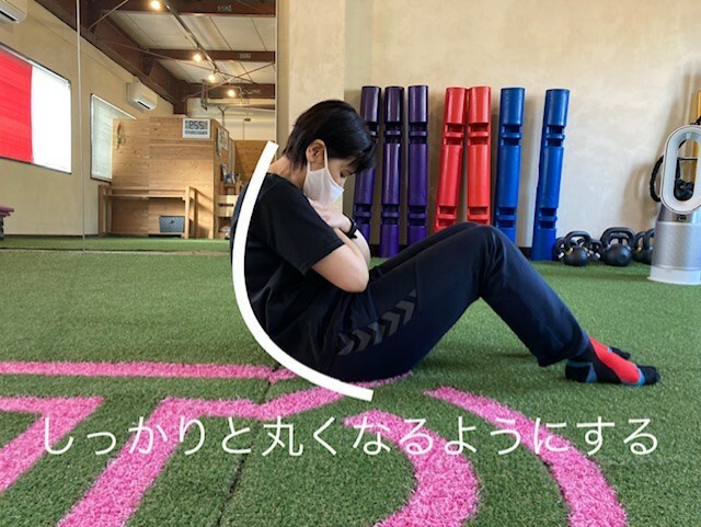 起き上がる時も同様に背骨の上から順番に床から離れていくようにゆっくりとまるまる様に行いましょう。