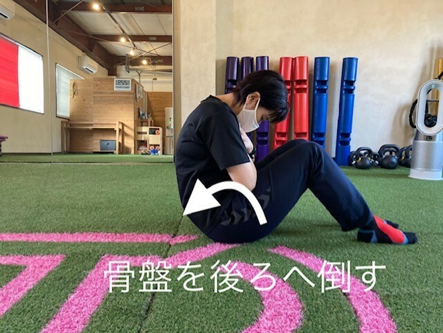 そこから骨盤を後ろに倒すようにお尻を後方へ倒しましょう。