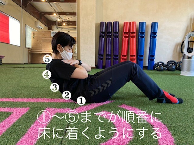 次に背中がゆっくりとまるくなる様に意識をして背骨の一番下の方から順番にゆっくりと床につくように体を後方へ倒れていきましょう。