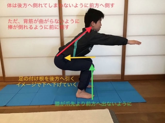 股関節を曲げようとすると後ろへ倒れそうになってしまうので腰を丸めてしまわないように体を前方へ傾けていく