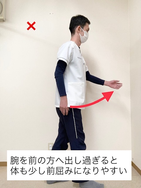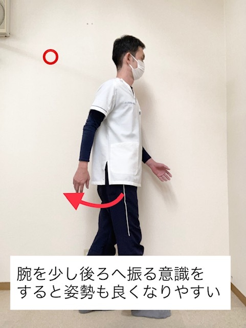 歩くときに腕の振りを後方へ意識してもらうだけで背中側の筋肉や肩甲骨の動きが良くなり、肩こりや頭痛または悪くなってしまった姿勢を改善することができます。