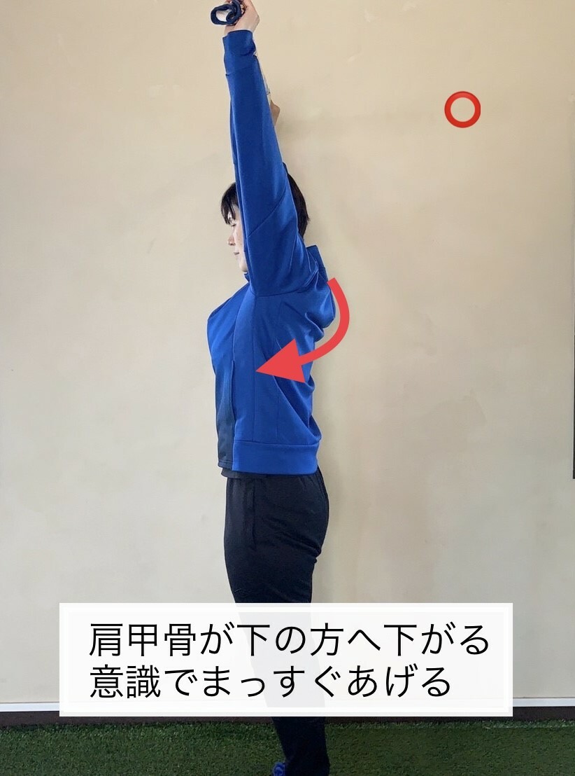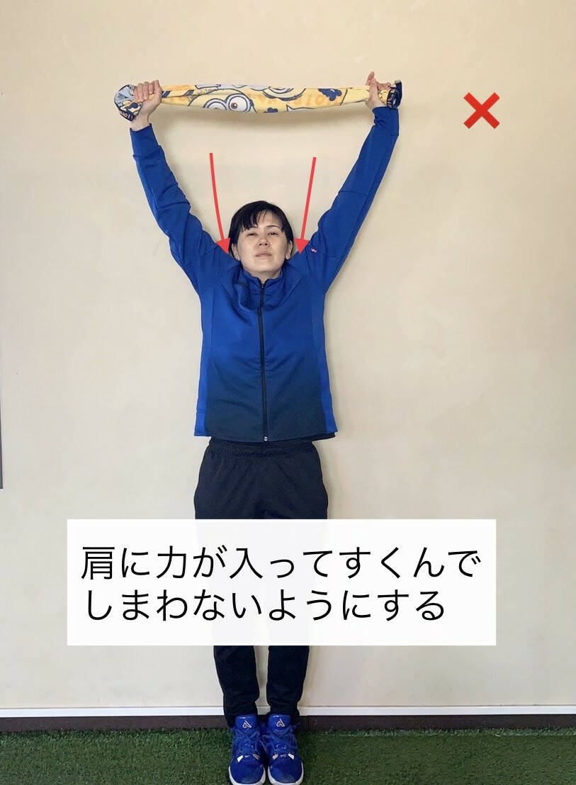 普段上げることが少ない位置まで動かすことで肩甲骨がいつもより下方向へ動きが良くなり、肩甲骨の下側にある筋肉をほぐすことができます。