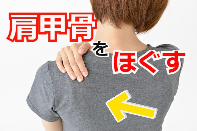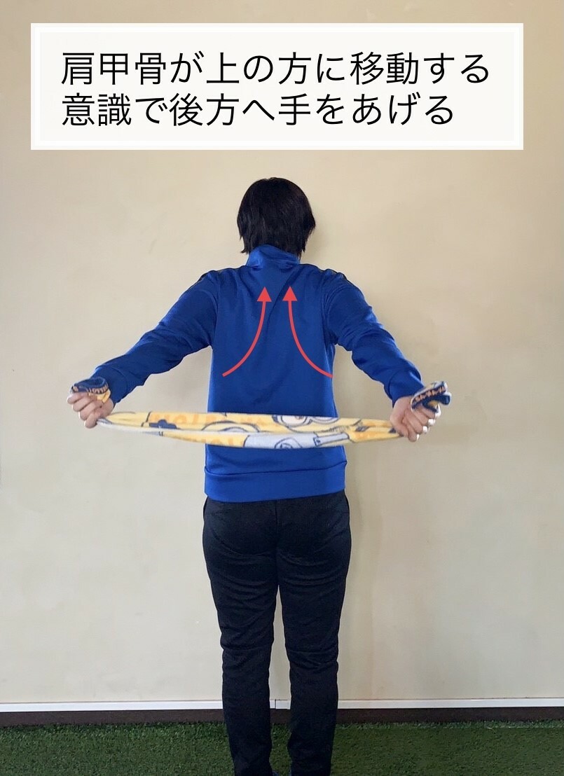 後方へ肩を動かすことにより肩甲骨がいつもより上方向へ動きが良くなり、肩甲骨の上側にある筋肉をほぐすことができます。