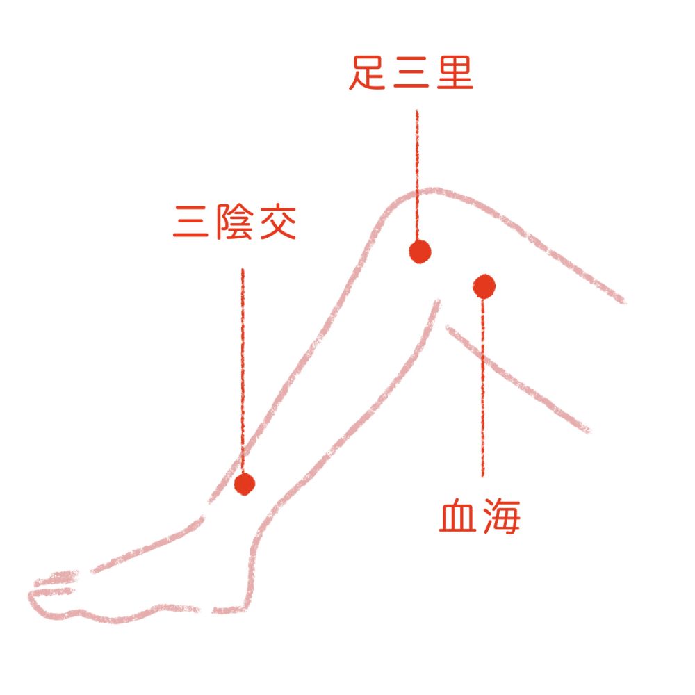 三陰交(さんいんこう)のツボは、内くるぶしから指の幅4本分上がったところにあります。冷え性の女性に特におすすめのツボです。