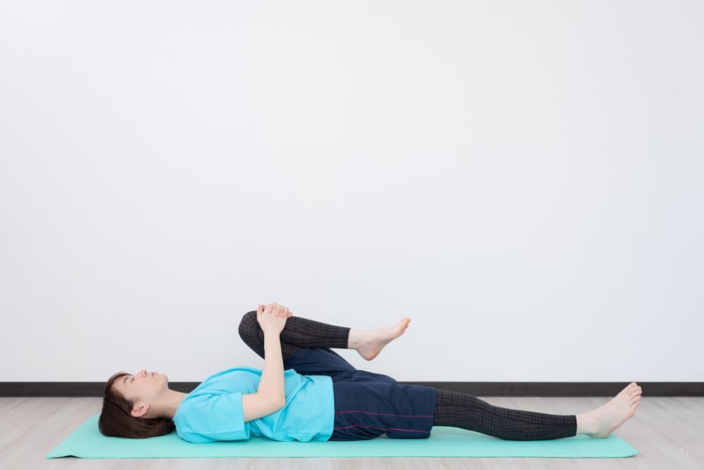 膝を反対側の肩へと引き付けることで、より効率的なストレッチングが可能です。